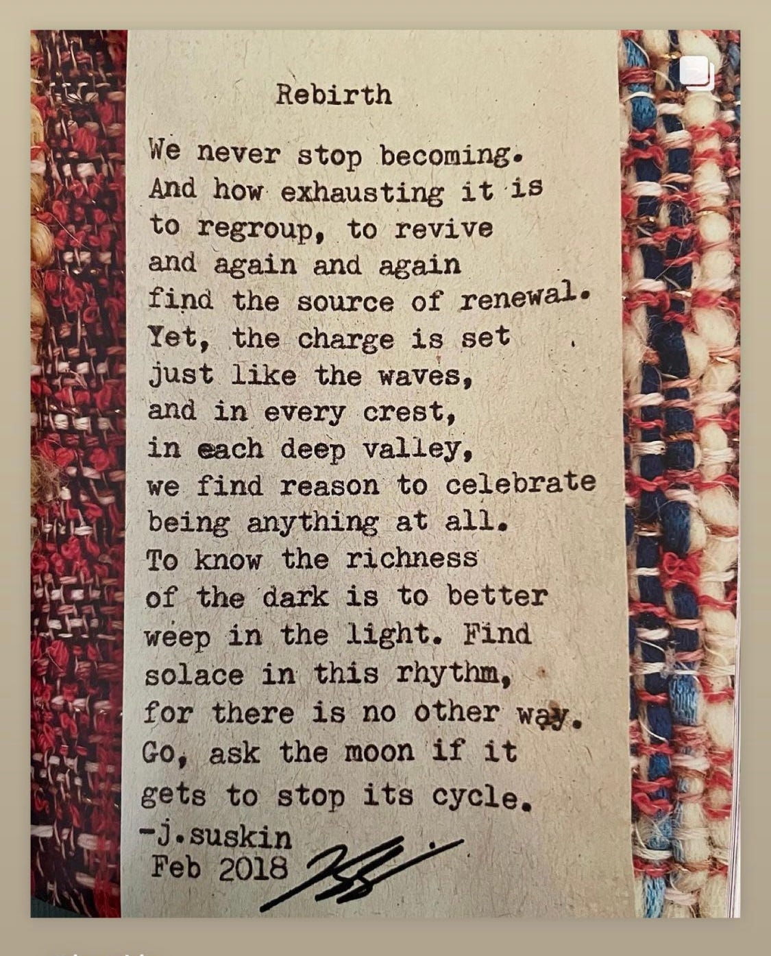 Select a line from Jacqueline Suskin’s poem above that resonates with you. What does that line make you wonder about? What does it help you remember about your truth and your values? What is the line a metaphor for in your life right now, and how does that metaphor offer permission for you to be as you are without needing to be fixed?